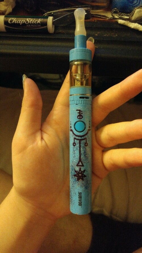 Один из современных оригинальных способов использования сигил, это применение вейп - ручки в качестве магического инструмента.(помните о том,что курение вредит организму) На данном изображении лаком для ногтей нанесен символ благословения (над кнопкой) и символ защиты (под кнопкой). Они созданы для того, чтобы заряжать содержащуюся жидкость намерением, наполняя легкие человека, а затем и воздух вокруг благословениями и защитой; сила самого пера (ручки) заряжает их.